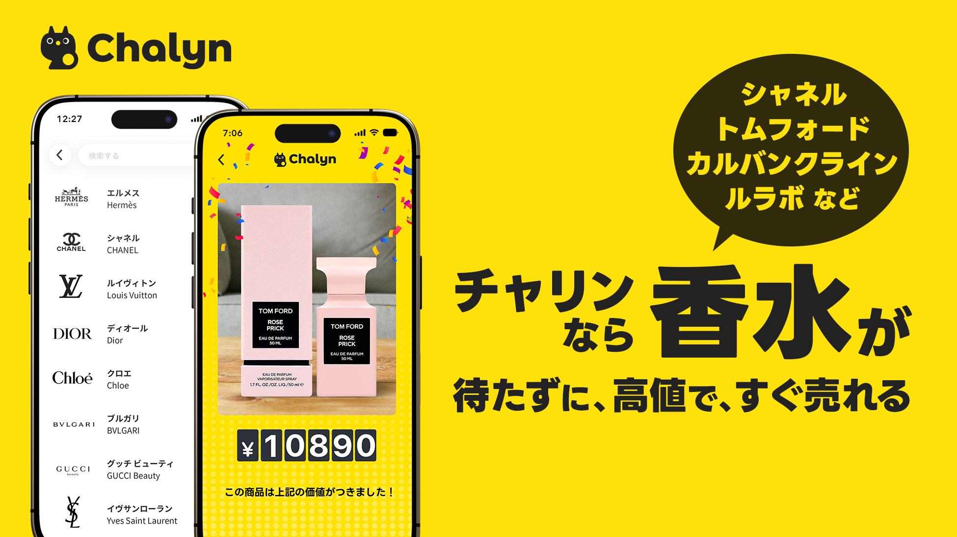 写真を撮るだけで手元のアイテムを即現金化できる AI 即金アプリ「Chalyn(チャリン)」にて、香水の買取を開始しました。シャネル、トムフォード、カルバンクライン、ルラボなど 70 ブランド以上に対応し、暮らしの変化に合わせた即時現金化ニーズに応えます。