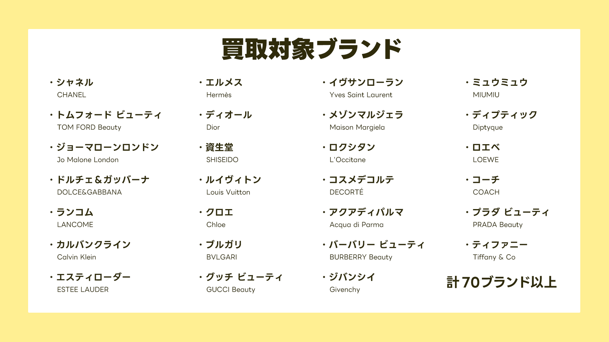 ACCA KAPPA(アッカカッパ)、Acqua di Parma(アクア・ディ・パルマ)、Aesop(イソップ)、Amouage(アムアージュ)、ANNICK GOUTAL(アニック グタール)、Armani Beauty(アルマーニ ビューティー)、BAUM(バウム)、Bdk(ビーディーケー)、Bond No.9(ボンド・ナンバーナイン)、BURBERRY Beauty(バーバリー ビューティー)、BVLGARI(ブルガリ)、Byredo(バイレード)、Calvin Klein(カルバン クライン)、CELINE(セリーヌ)、CHANEL(シャネル)、Chloé(クロエ)、COACH(コーチ)、CREED(クリード)、D'ORSAY(ドルセー)、DECORTÉ(コスメデコルテ)、Dior(ディオール)、Diptyque(ディプティック)、DOLCE&GABBANA(ドルチェ&ガッバーナ)、ESTEE LAUDER(エスティ ローダー)、Ferragamo(フェラガモ)、FLORIS(フローリス)、FUEGUIA(フエギア)、Givenchy(ジバンシイ)、GUCCI Beauty(グッチ ビューティー)、Guerlain(ゲラン)、HEELEY(ヒーリー)、HERMETICA(エルメティカ)、Hermès(エルメス)、JIL SANDER(ジル サンダー)、JILLSTUART Beauty(ジルスチュアート ビューティー)、JIMMY CHOO(ジミー チュウ)、Jo Malone London(ジョー マローン ロンドン)、Kilian(キリアン)、L'Artisan Parfumeur(ラルチザン パフューム)、L'Occitane(ロクシタン)、Laboratorio Olfattivo(ラボラトリオ オルファッティーボ)、LANCOME(ランコム)、Le Labo(ル ラボ)、LOEWE(ロエベ)、Louis Vuitton(ルイ ヴィトン)、Maison Francis Kurkdjian(メゾン フランシス クルジャン)、Maison Kitsuné(メゾン キツネ)、Maison Margiela(メゾン マルジェラ)、mcm(エムシーエム)、Miller Harris(ミラー ハリス)、MIUMIU(ミュウミュウ)、MOLTON BROWN(モルトンブラウン)、Narciso Rodriguez Beauty(ナルシソ ロドリゲス ビューティー)、Nasomatto(ナーゾマット)、Nishane(ニシャネ)、OFFICINE UNIVERSELLE BULY(オフィシーヌ・ユニヴェルセル・ビュリー)、PARLE MOI DE PARFUM(パルル モア ドゥ パルファム)、PENHALIGON'S(ペンハリガン)、PRADA Beauty(プラダ ビューティー)、Santa Maria Novella(サンタ・マリア・ノヴェッラ)、SATORI(サトリ)、SERGE LUTENS(セルジュ ルタンス)、SHIRO(シロ)、SHISEIDO(シセイドウ)、SHOLAYERED(ショーレイヤード)、The Different Company(ザ ディファレント カンパニー)、Tiffany & Co(ティファニー)、TOM FORD Beauty(トム フォード ビューティー)、TRUDON(トゥルドン)、Versace(ヴェルサーチェ)、Yves Saint Laurent(イヴ サンローラン)